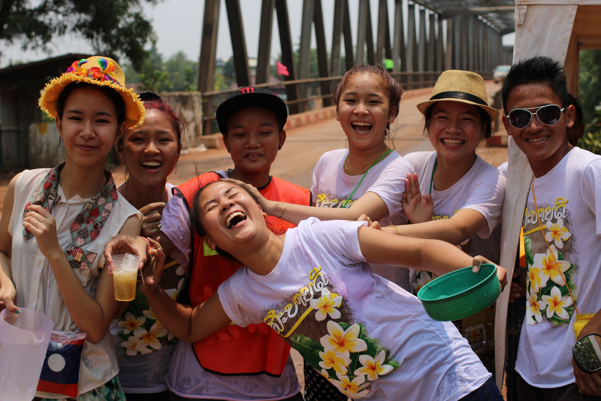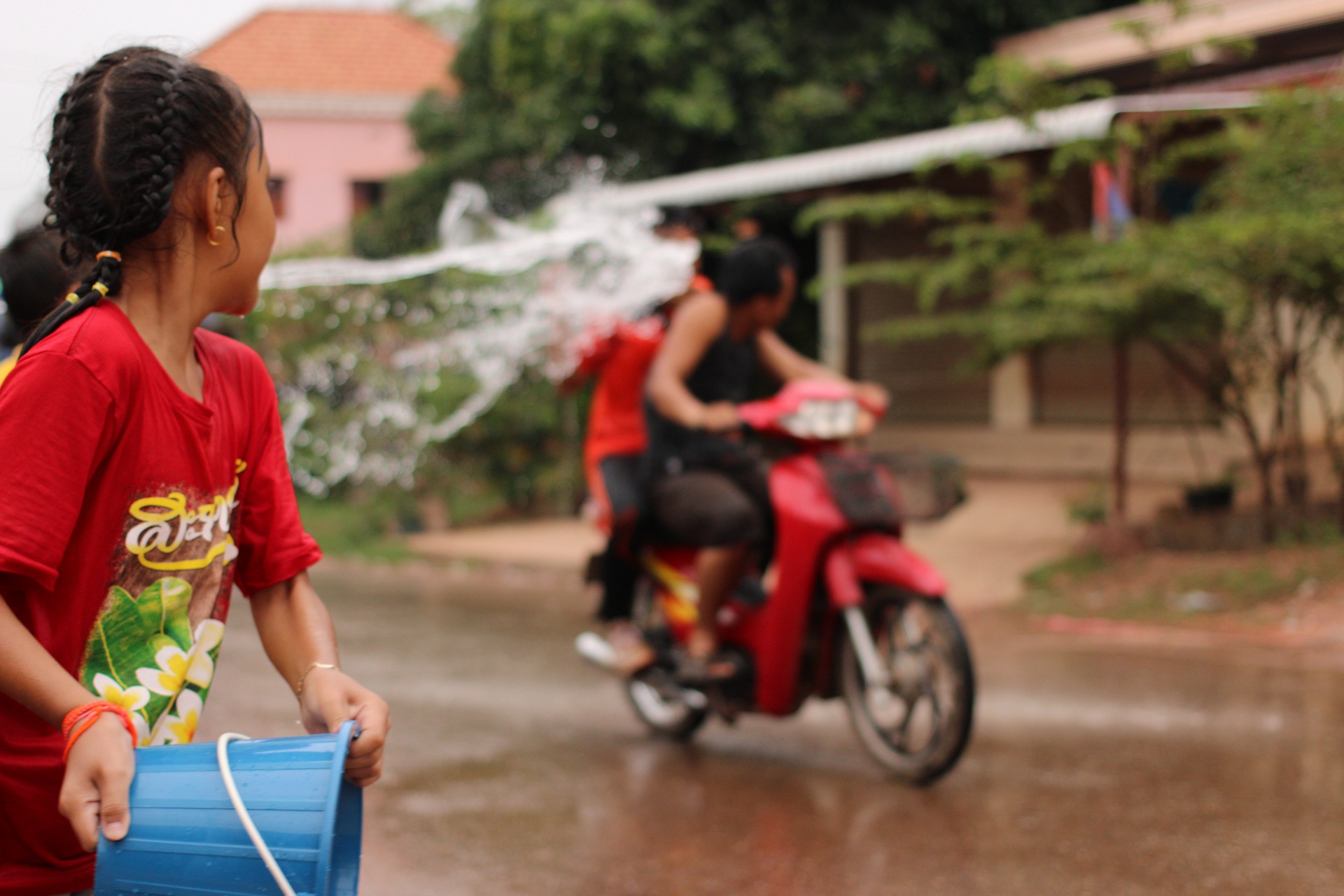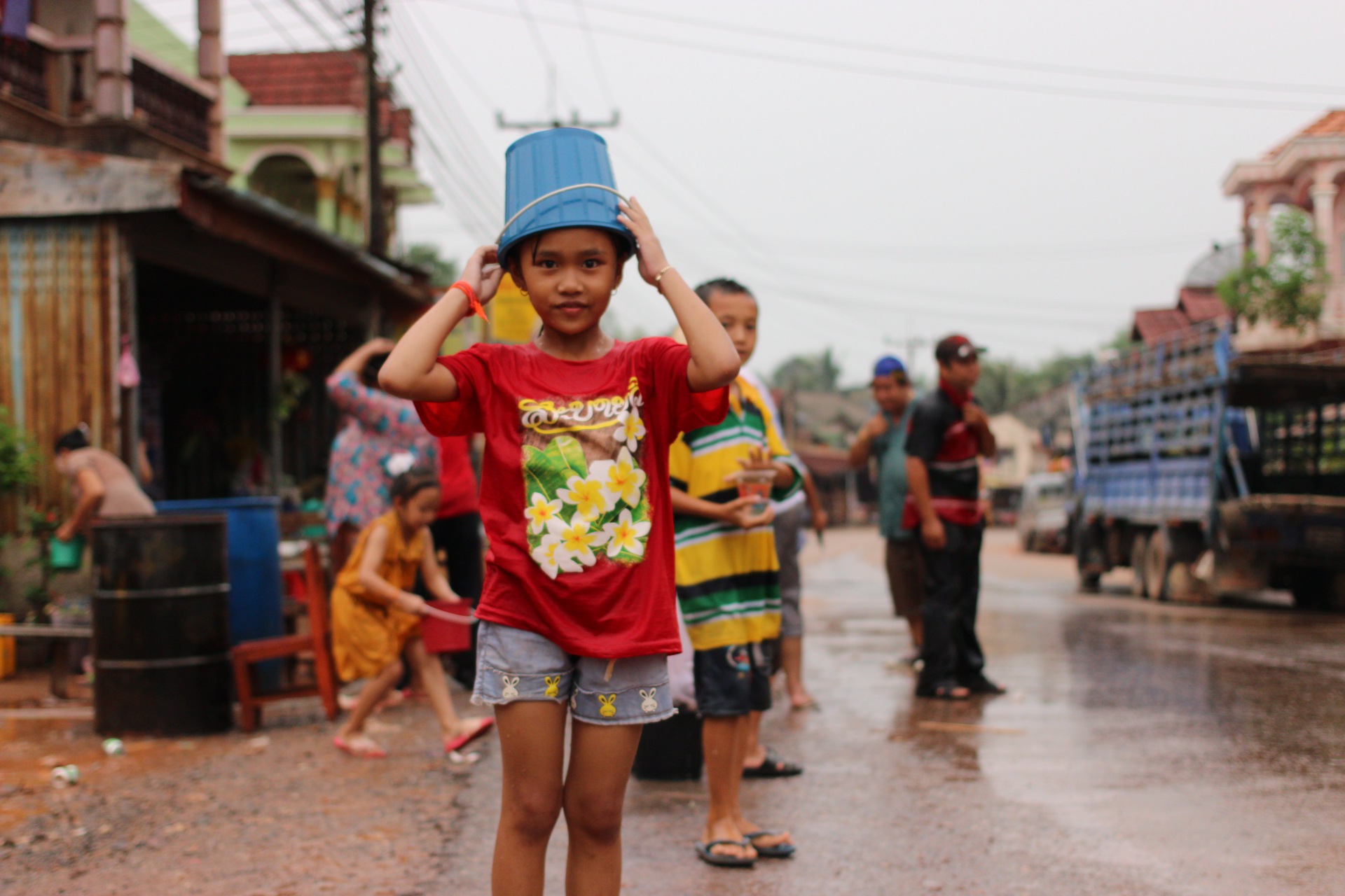 Depuis le début du voyage, les laotiens sont surpris lorsqu’ils nous voient. Les laos armés de seau d’eau ne savent pas s’ils doivent nous arroser. Pour les aider dans leur indécision, je m’amuse à leur faire d’horribles grimaces, puis j’accèlere. Anne, qui n’a rien fait, se prend toute l’eau. Moi, je reste sec.