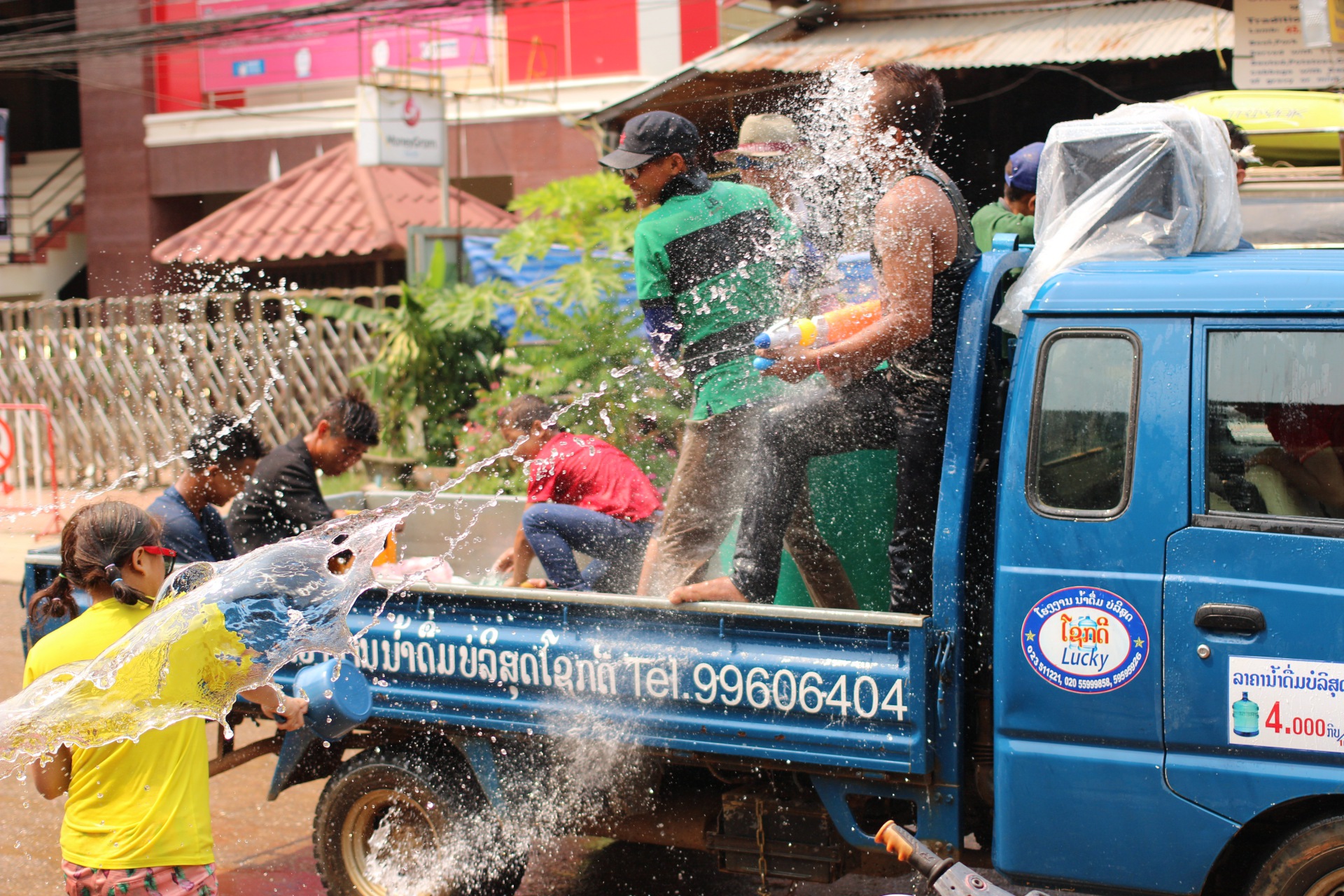 Depuis le début du voyage, les laotiens sont surpris lorsqu’ils nous voient. Les laos armés de seau d’eau ne savent pas s’ils doivent nous arroser. Pour les aider dans leur indécision, je m’amuse à leur faire d’horribles grimaces, puis j’accèlere. Anne, qui n’a rien fait, se prend toute l’eau. Moi, je reste sec.